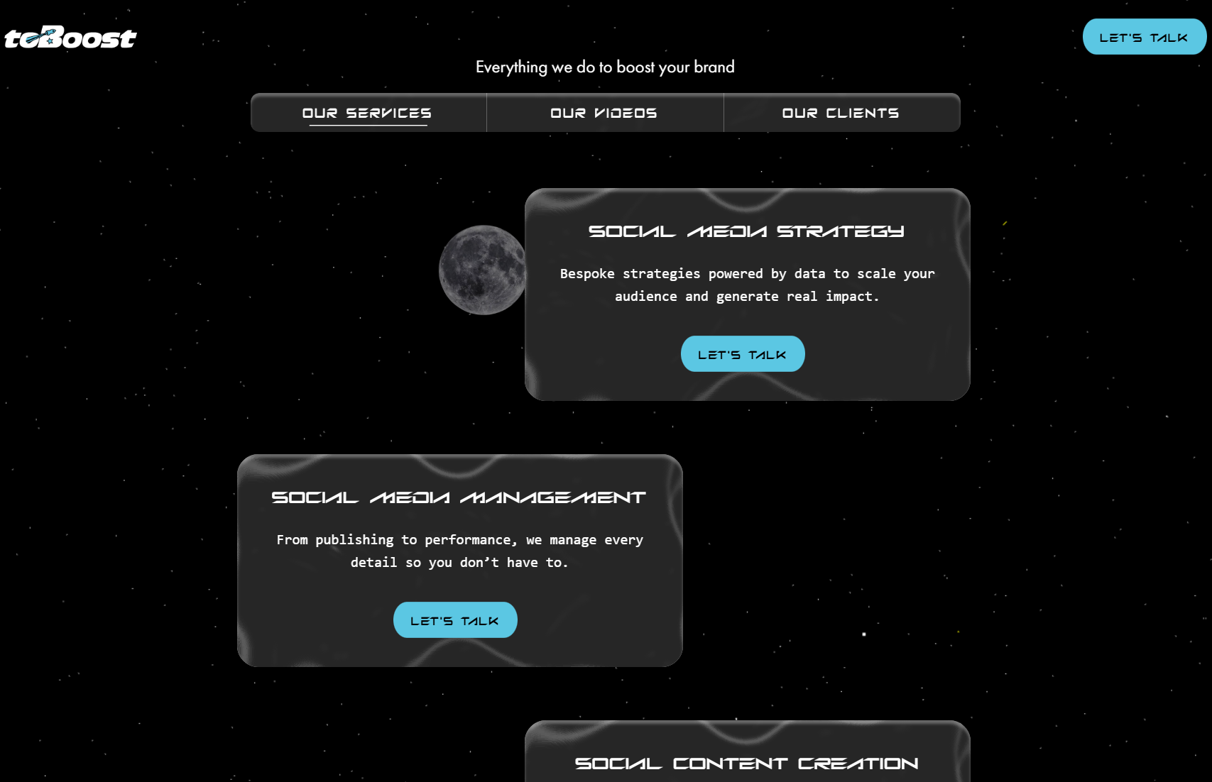 Designed with responsiveness in mind, the website adjusts smoothly for desktop and mobile views, ensuring that dynamic social media thumbnails and embedded content maintain visual impact across devices. Visual hierarchy and balanced spacing create a professional and engaging experience that supports ToBoost’s digital presence.